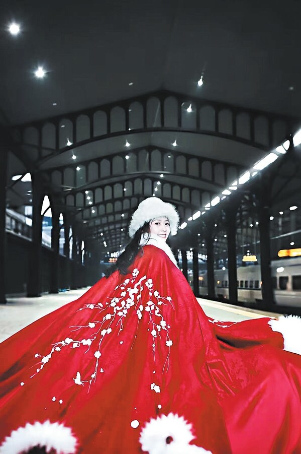 A tourist dresses up and poses for photos at Harbin Railway Station. [Provided to China Daily]